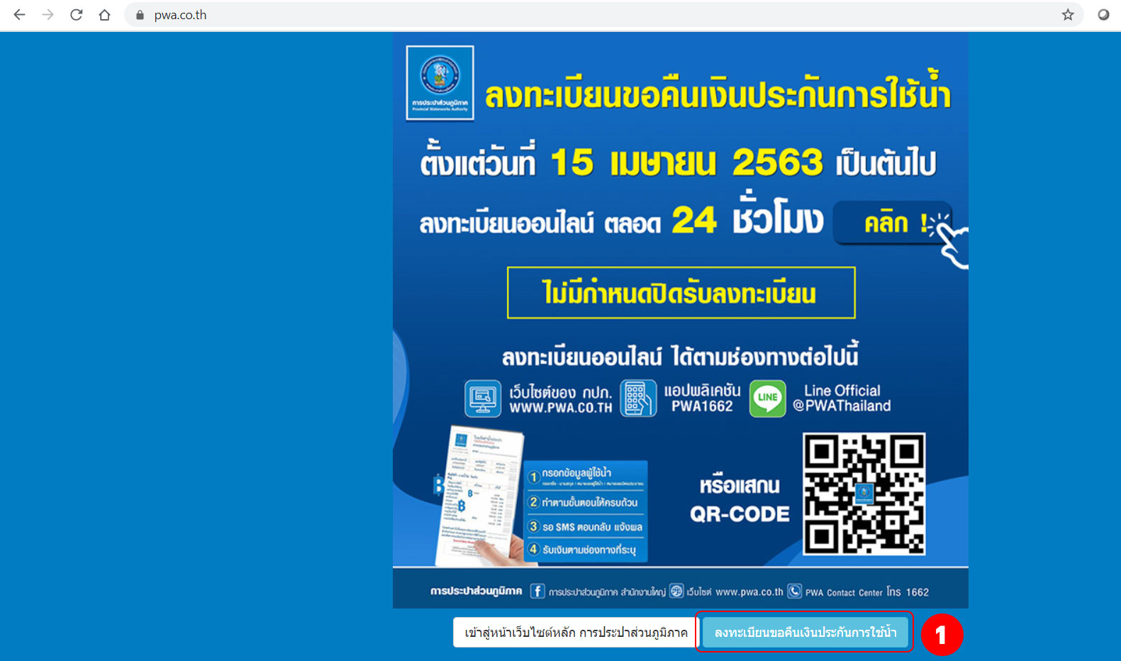 1. เข้าเวป https://www.pwa.co.th แล้วเลือก ลงทะเบียนขอคืนเงินประกันการใช้น้ำ