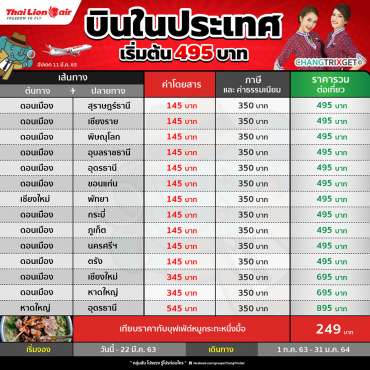 โปรโมชั่น Thai Lion Air เส้นทางในประเทศ เริ่มต้น 495 บาท/เที่ยว รวมภาษีแล้ว