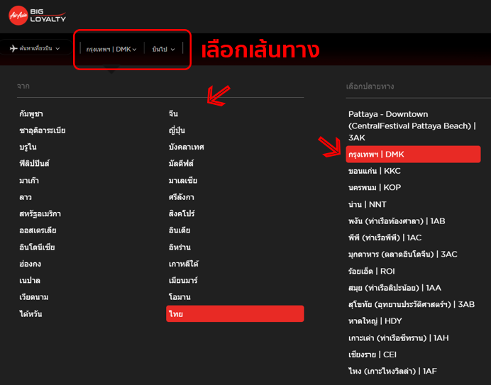 - เลือกจุดหมายปลายทางที่ต้องการ โดยคลิกที่ “บินจาก” “บินไป” ตามแถบซ้ายบน