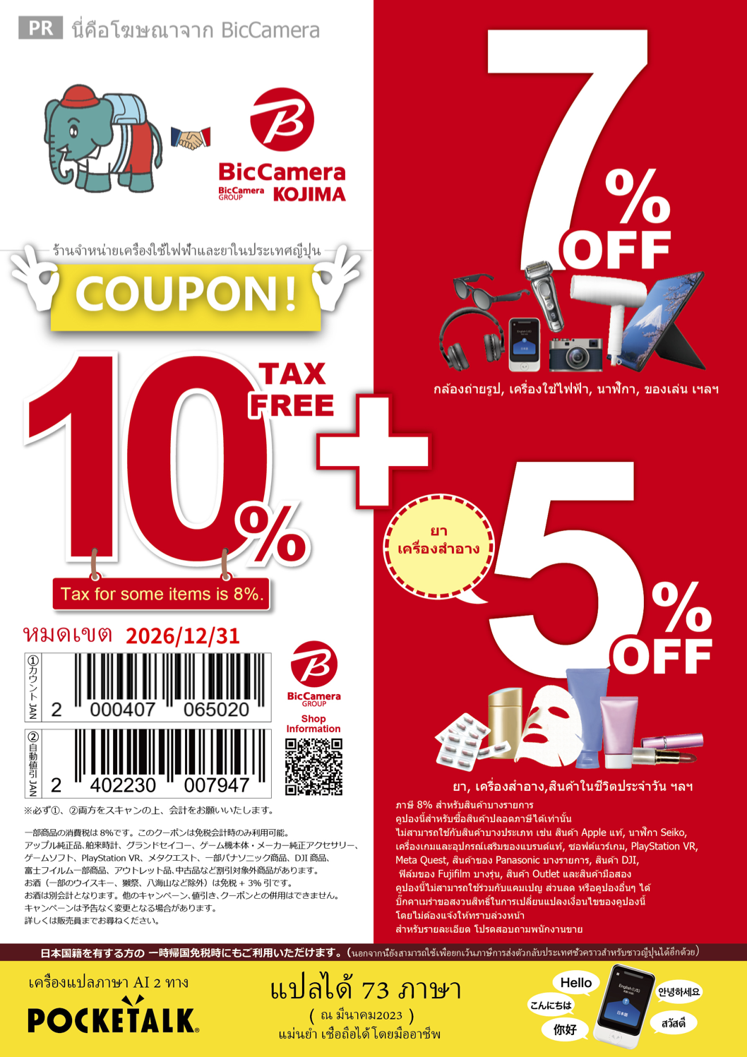 ไปญี่ปุ่นทั้งที..ห้ามพลาดแวะไปช้อปที่ BIC CAMERA ร้านชื่อดังของญี่ปุ่นที่รวมครบทุกอย่างไว้ในที่เดียว ! ไม่ว่าจะเป็นสินค้าอิเล็กทรอนิกส์ เครื่องสำอาง ยา ไปจนถึงของใช้ในชีวิตประจำวัน ได้รับความนิยมทั้งคนญี่ปุ่นและนักท่องเที่ยวต่างชาติ มีหลายสาขาอยู่ในตามเมืองใหญ่ต่าง ๆ ทั่วประเทศ เช่น โตเกียว โอซาก้า ฟุกุโอกะ ฯลฯ ที่สำคัญ นักท่องเที่ยวสามารถ ช้อปแบบปลอดภาษี (Tax Free) ได้ง่าย ๆ เพียงแค่แสดงพาสปอร์ต (Passport) ตอนชำระเงินก็รับส่วนลดได้ทันที สะดวกสุด ๆ