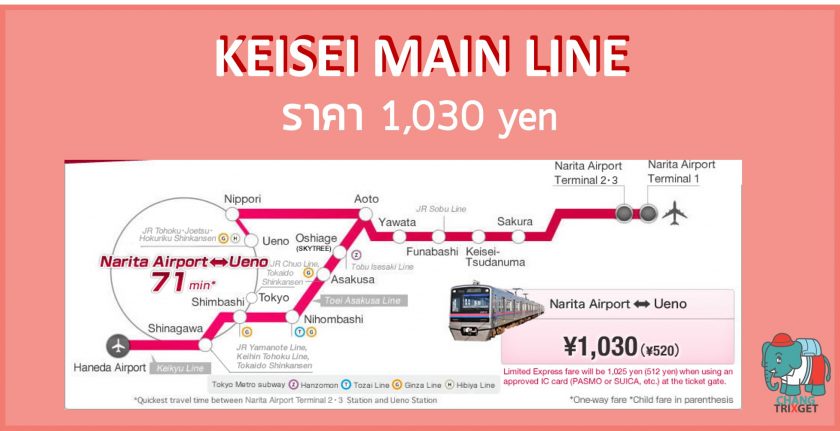 Keisei Main Line เป็นรถไฟฟ้าธรรมดาของบริษัท Keisei ราคาจะอยู่ที่ 1,030 เยนหรือประมาณ 310 บาท ซึ่งรถไฟตัวนี้จะแวะรับส่งผู้โดยสารตามป้ายที่กำหนดไว้